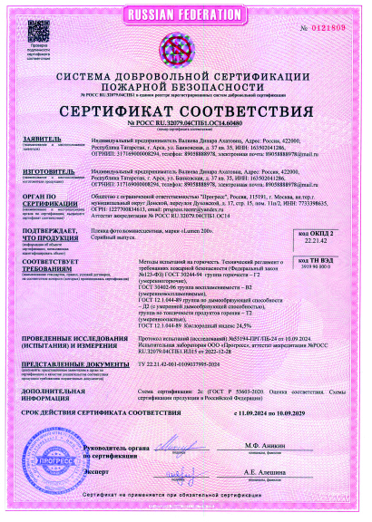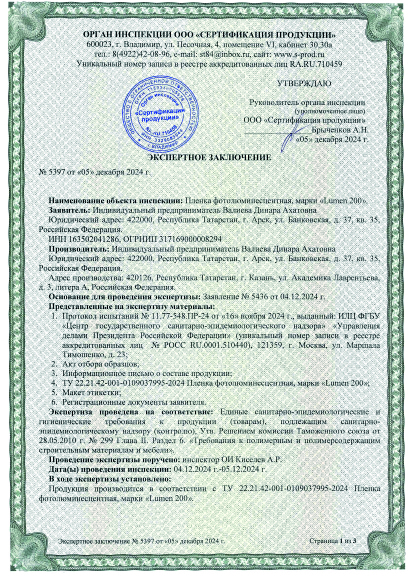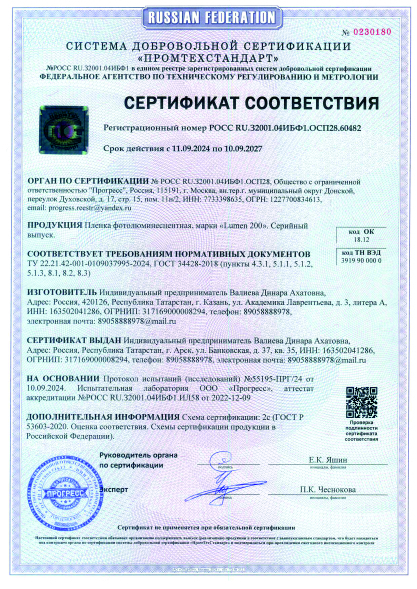Фотолюминесцентная пленка Lumen 200 полностью соответствует ГОСТ, что подтверждают протоколы испытаний
